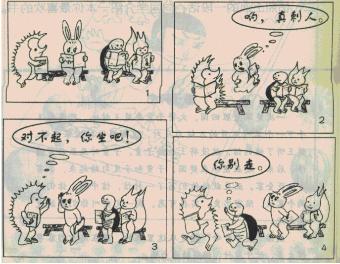 小刺猬在找座位,它看到小兔旁边有一个座位,就一屁股坐了下来。突然,小兔猛地一下子跳起来,尖叫一声:“哟,真刺人!”